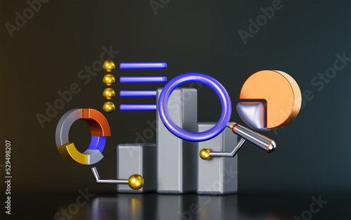 The watermark will not be included on Poster.: Business line chart with pie magnify glass on dark background 3d render concept for data research