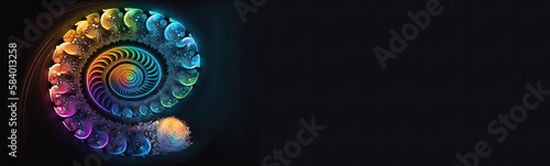 Poster card with colorful spiral, fantasy color swirls on dark background, copy space with surreal fractal,