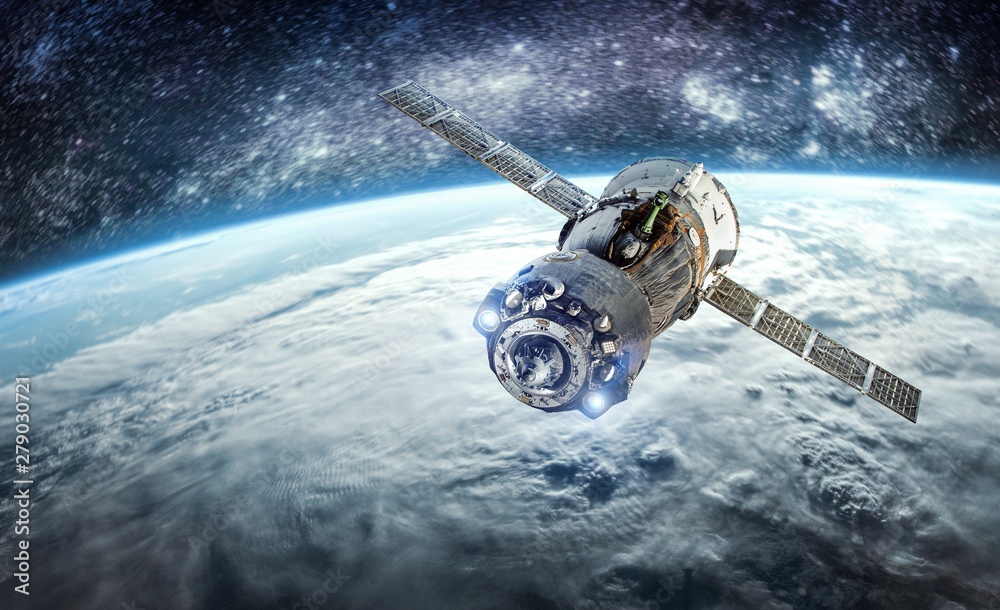 The watermark will not be included on Poster.: Cargo spacecraft in the space near earth planet - nebula and stars - spaceship - elements of this image
