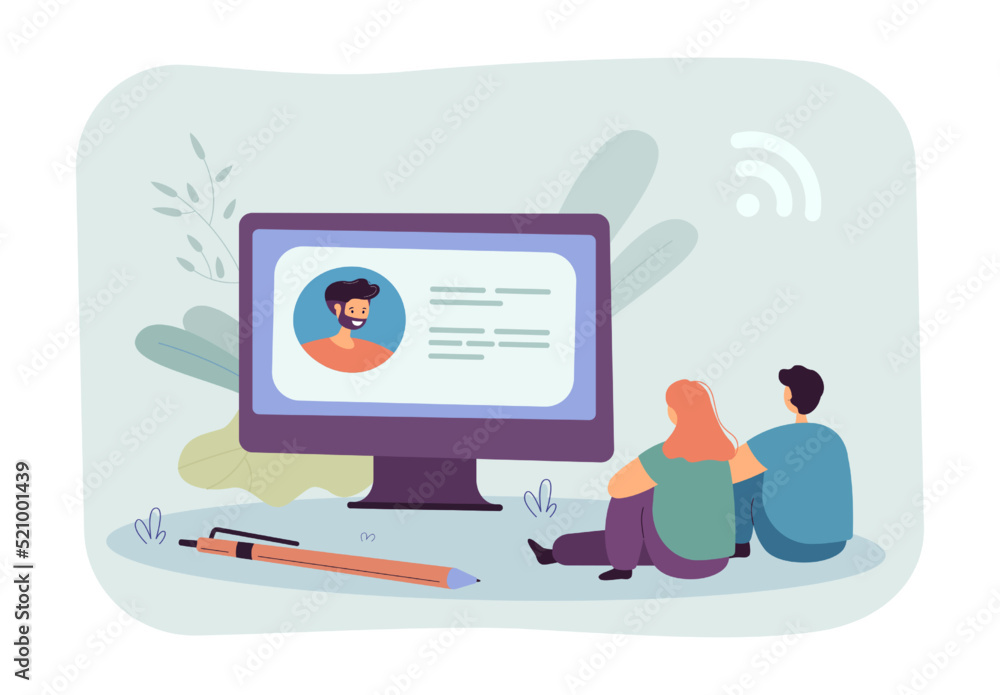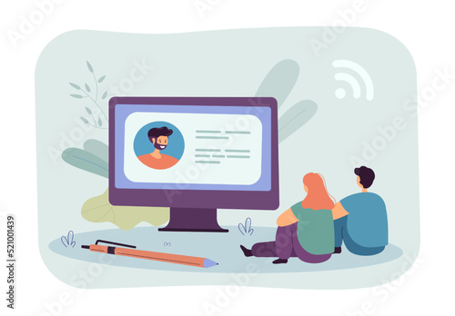 The watermark will not be included on Poster.: Cartoon students watching lecture on huge computer screen - teacher or tutor teaching children via in