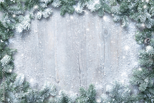 Poster christmas and new year background with fir branches and snowfall