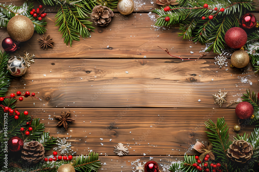 Poster : Christmas background with fir branches, decorations and ornaments in the frame and empty space on ru