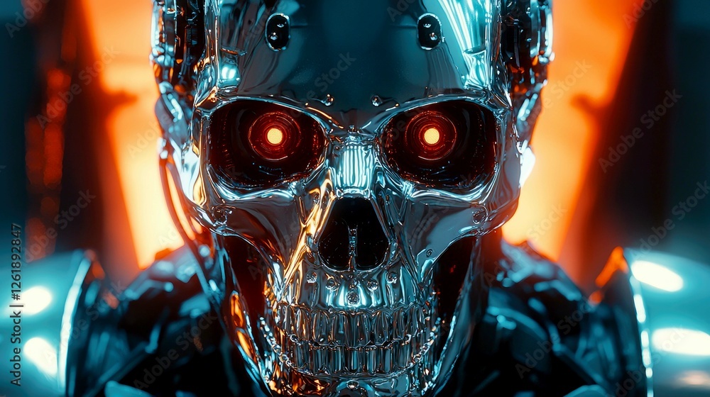 Poster chrome skull robot: a glowing cyberpunk android in a dark, futuristic setting - Posters Poster chrome skull robot: a glowing cyberpunk android in a dark, futuristic setting - Posters