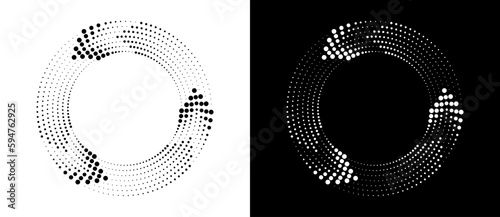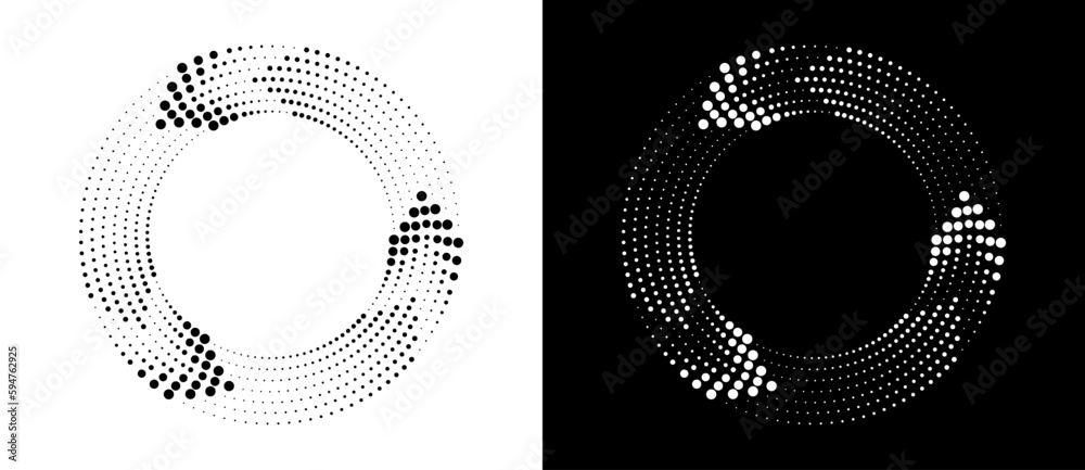 The watermark will not be included on Poster.: Circle abstract background with dynamic halftone dots like arrows - black shape on a white background