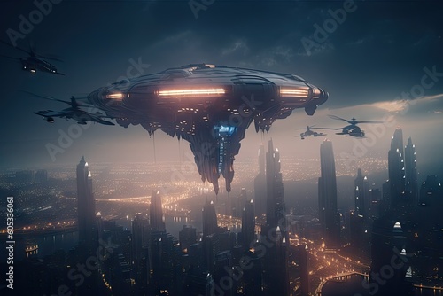 Poster cityscape with massive spaceship hovering above, ready to take off, created with generative ai