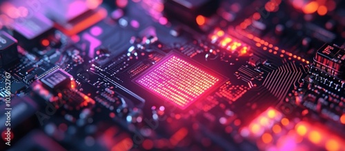 The watermark will not be included on Poster.: Close-up of a glowing red circuit board with a central processing unit -