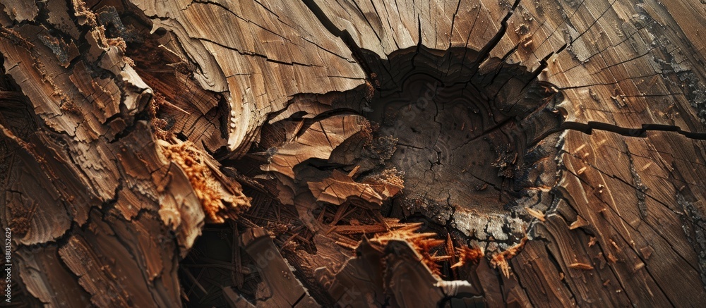 Poster : Close up of a shattered tree trunk with splintered wood fibers on a textured wooden background in br
