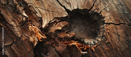 Close up of a shattered tree trunk with splintered wood fibers on a textured wooden background in brPoster