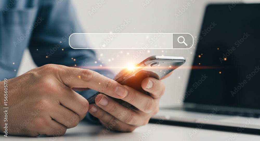 Poster close-up of hands holding smartphone with a search bar interface overlay, showcasing online search a