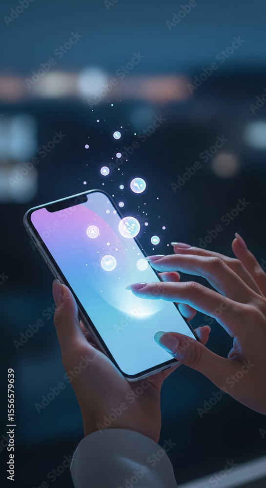 The watermark will not be included on Poster.: Close-up of hands using smartphone, glowing icons emanating from screen, suggesting digital interact