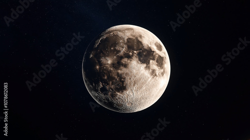 The watermark will not be included on Poster.: Close-up view of the moon's surface with craters and dark lunar maria in outer space against a starr