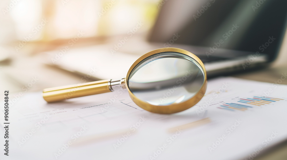 Poster closeup of magnifying glass on notebook device - focusing on website traffic data, graphs, and analy - Posters Poster closeup of magnifying glass on notebook device - focusing on website traffic data, graphs, and analy - Posters