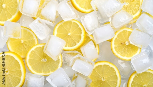The watermark will not be included on Poster.: Closeup of refreshing lemon slices and sparkling ice cubes, a summer delight refreshing
