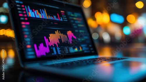 Poster closeup screen of the laptop, displaying the colorful website traffic metrics, graphs and analytics