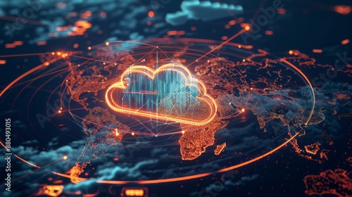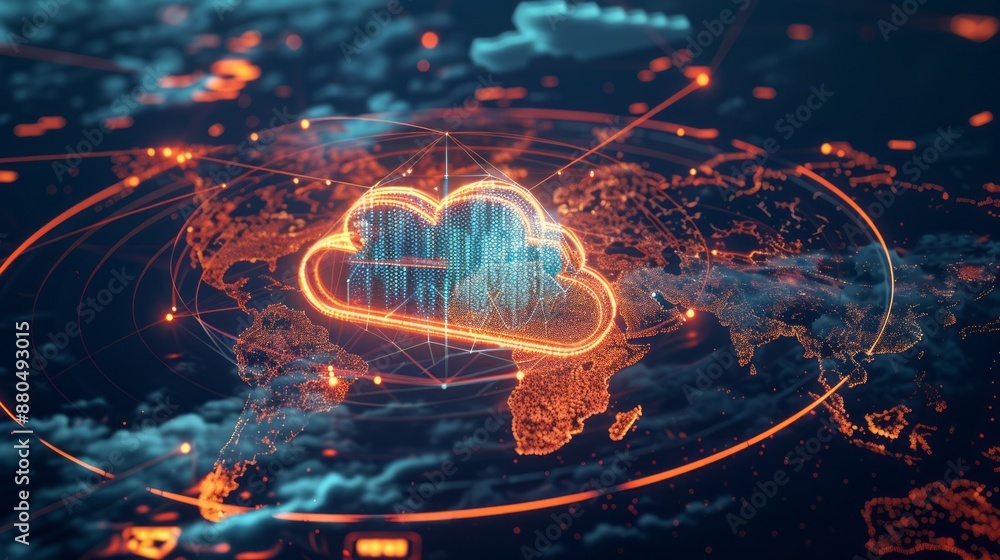 The watermark will not be included on Poster.: Cloud computing technology concept with large cloud icon and global connectivity on abstract world m