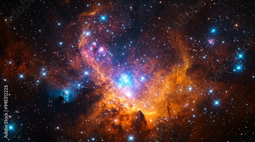 The watermark will not be included on Poster.: Cluster of stars surrounded by colorful gas clouds in deep space