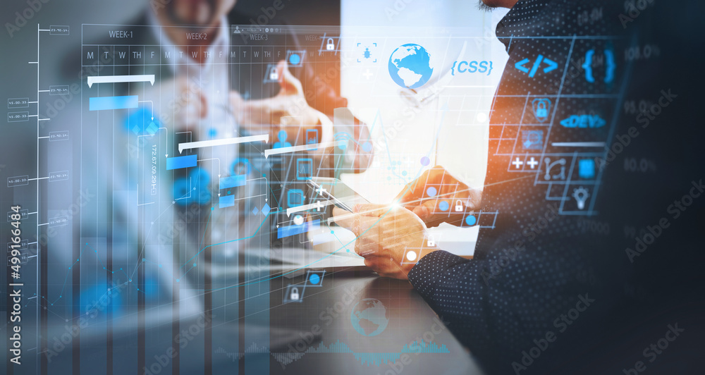 Poster co working team meeting concept,businessman using smart phone and digital tablet and laptop computer