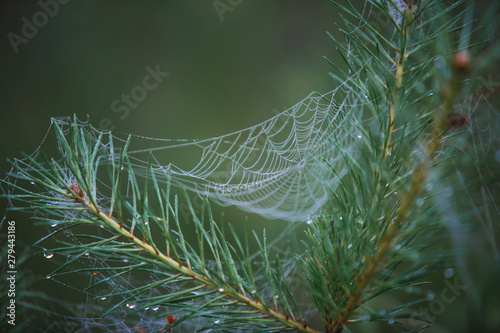 Poster cobwebs on the grass and branches of trees. the web grid is illuminated by the morning sunlight