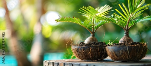 The watermark will not be included on Poster.: Coconut trees are made bonsai, photographed in closeup - copy space image - place for adding text and