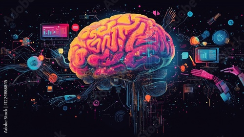 Poster : Collage art featuring a diverse ai brain with robotic arms performing tasks like designing and manag