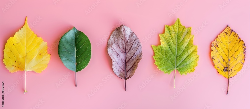 The watermark will not be included on Poster.: Collage of different leaves isolated on pastel background - copy space image - place for adding text a