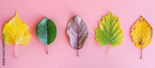 Collage of different leaves isolated on pastel background - copy space image - place for adding text aPoster