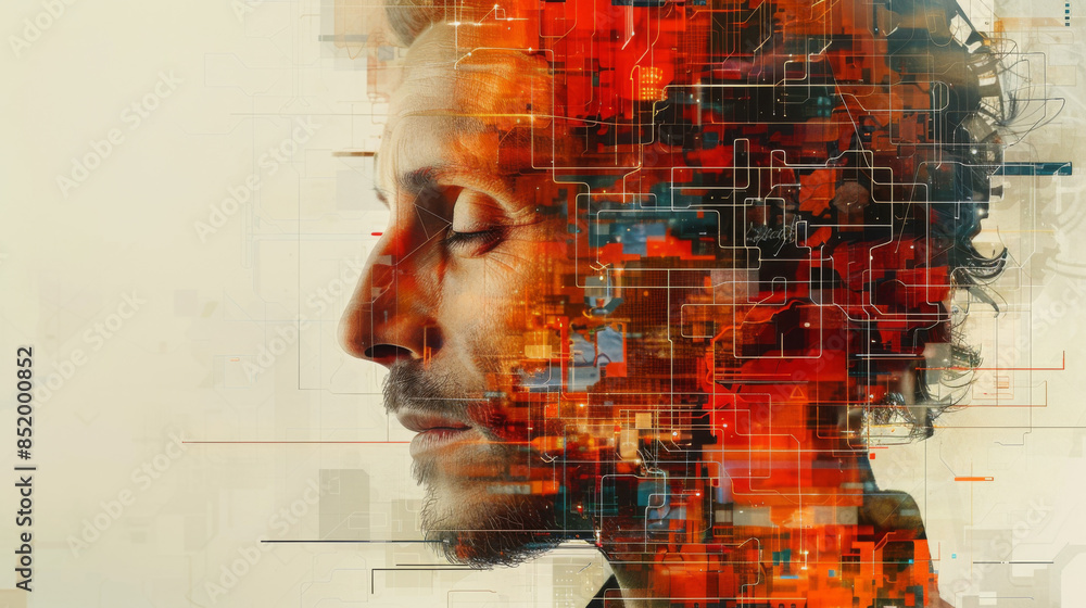 The watermark will not be included on Poster.: Collage of human head, digits and various abstract elements on the subject of artificial intelligenc