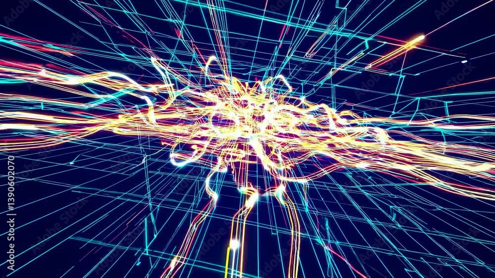 The watermark will not be included on Poster.: Colorful, glowing lines create a mesmerizing plexus effect against a dark background, symbolizing co