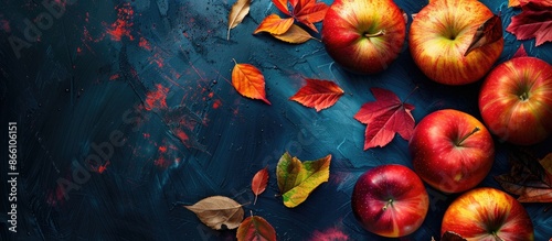 The watermark will not be included on Poster.: Colorful autumn leaves and apples create a vibrant autumn background with copy space image -