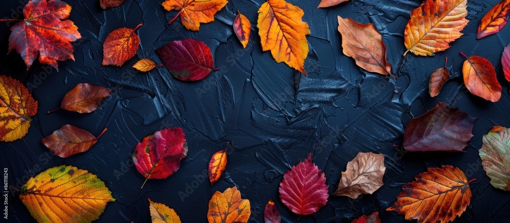 Poster colorful various autumn fallen leaves on a dark black background. seasonal background and texture. t