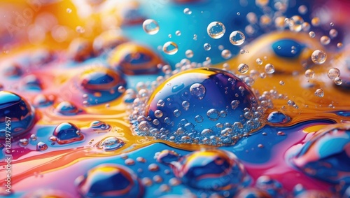 The watermark will not be included on Poster.: Colorful water droplets on a vibrant fluid surface with bubbles and reflections creating a dynamic a