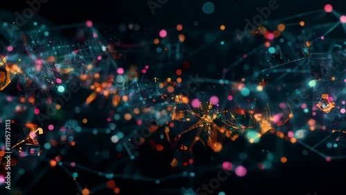 The watermark will not be included on Poster.: Complex network forms and evolves, showcasing glowing dots and lines that appear and disappear again