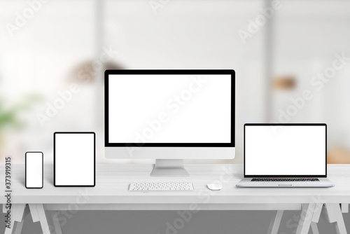 Poster : Computer display, laptop, tablet and smart phone on office desk with isolated display for web site,