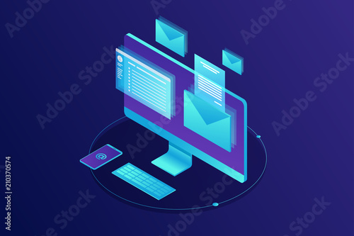 Poster concept of development and software. monitor with program code on screen and open web pages. digital