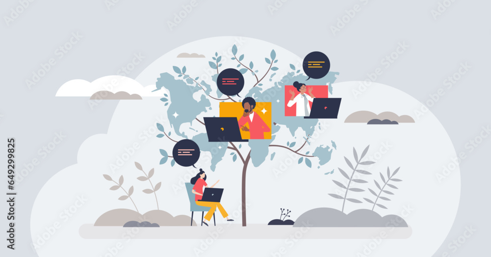 The watermark will not be included on Poster.: Conference call using online group talking software tiny person concept - virtual seminar, learning o