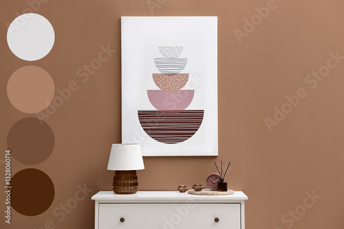 The watermark will not be included on Poster.: Console table with lamp, candles, clock and reed diffuser near wall in mocha mousse shade - interior