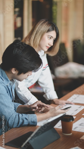 Cropped view of ui designer planing the ux application development with team membersPoster