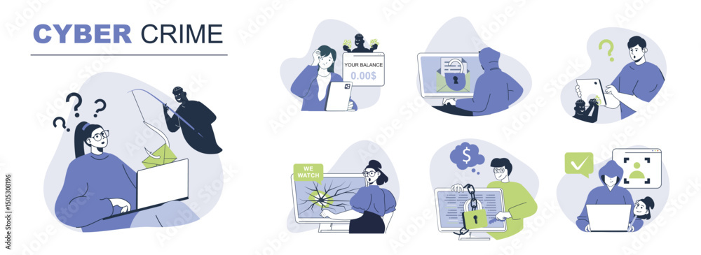 The watermark will not be included on Poster.: Cyber crime concept set for web design - collection with people suffering from stealing data, hacking