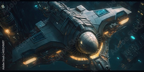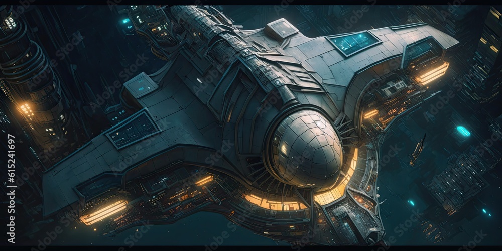 Poster cyber punk spaceship seen from above. glorious generative ai.