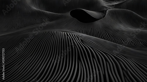 The watermark will not be included on Poster.: Dark, flowing landscape formed by thin parallel lines creating a textured, abstract terrain
