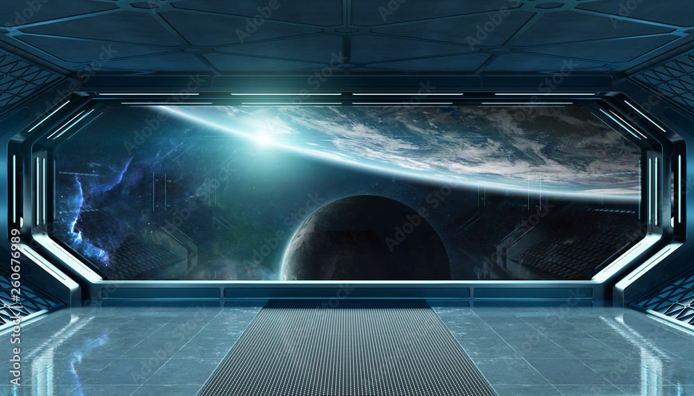 The watermark will not be included on Poster.: Dark blue spaceship futuristic interior with window view on space and planets 3d rendering