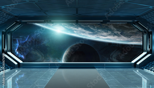 Poster : Dark blue spaceship futuristic interior with window view on space and planets 3d rendering