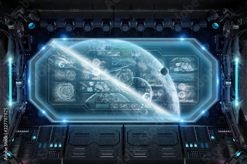 The watermark will not be included on Poster.: Dark spaceship interior with control panel digital screens 3d rendering