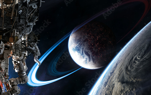 Deep space planets, orbiting space station - science fiction - elements of this image furnished by nasPoster