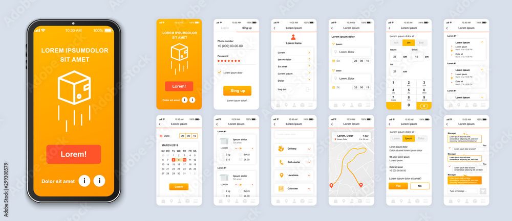 The watermark will not be included on Poster.: Delivery mobile app smartphone interface vector templates set - online parcel shipping web page desig