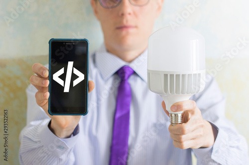 Poster developer holds smartphone with programming code icon on screen and led lamp. mobile app coding inno