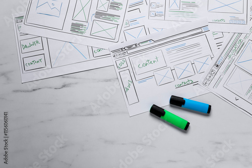 Developing ui design - sketches of website wireframes and felt pens on white marble table, top viewPoster