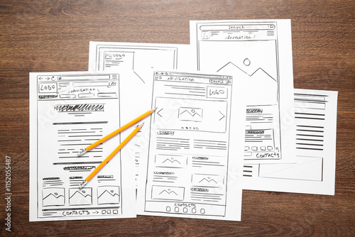 The watermark will not be included on Poster.: Developing ui design - sketches of website wireframes and pencils on wooden table, top view