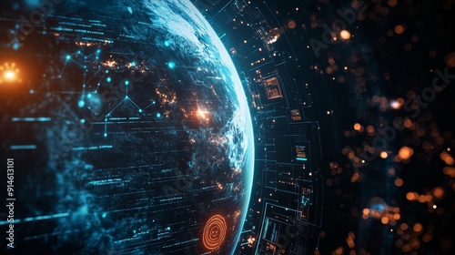 The watermark will not be included on Poster.: Digital globe with glowing data connections on a dark background