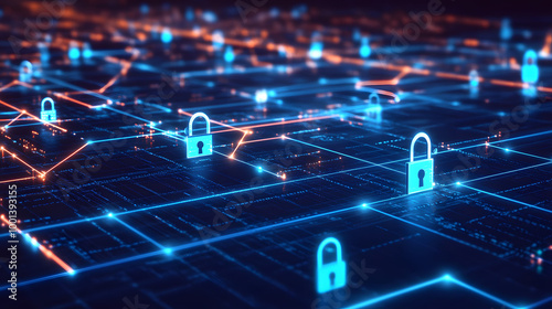 The watermark will not be included on Poster.: Digital illustration of cybersecurity network internet system web data centre protection padlock sym